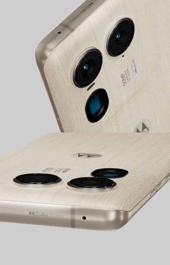 A Motorola oferece o modelo com diferentes acabamentos: o elegante estilo “Wood”, o clássico preto e a cor oficial da Pantone “Peach Fuzz”.